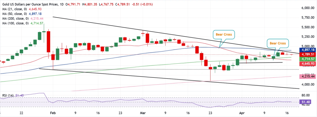With the US-Iran two-week ceasefire set to end on April 22, investors remain unnerved over the timing and the outcome of the next round of peace talks, leaving Gold price gyrating in a familiar range.